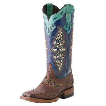2021女士时尚牛仔靴休闲刺绣PU皮革复古及膝高平靴牛仔女靴